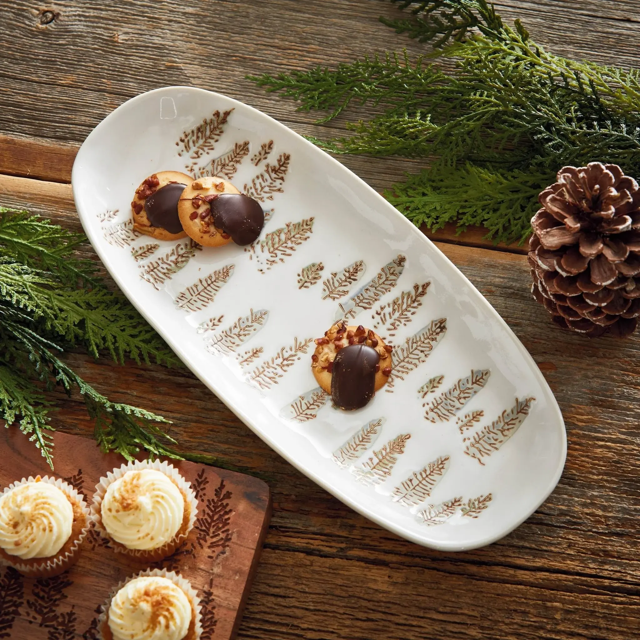Elevate your dining experience with this elegant Aspen Oval Platter. Crafted from high-quality stoneware, this platter features a sleek, organic shape and a delicate pine tree design, inspired by the serene beauty of the Aspen forest. Its neutral white color and understated design make it a versatile piece that can be used for a variety of occasions, from casual dinners to formal gatherings.