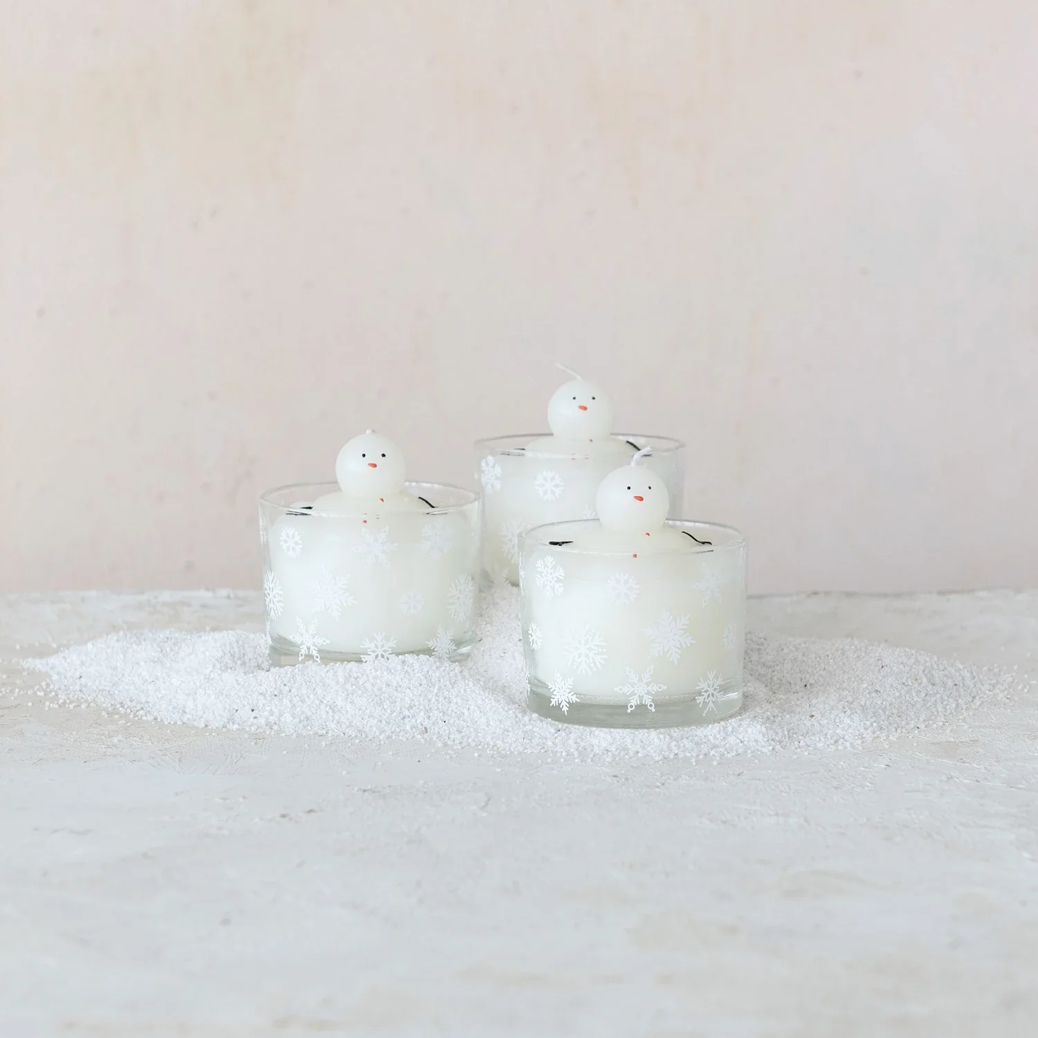 SPECIFICATIONS:3-3/4" Round x 4"HUnscented MeltingSnowman Candle In Glass Vessel w/ SnowflakesBurn time - 45 hours