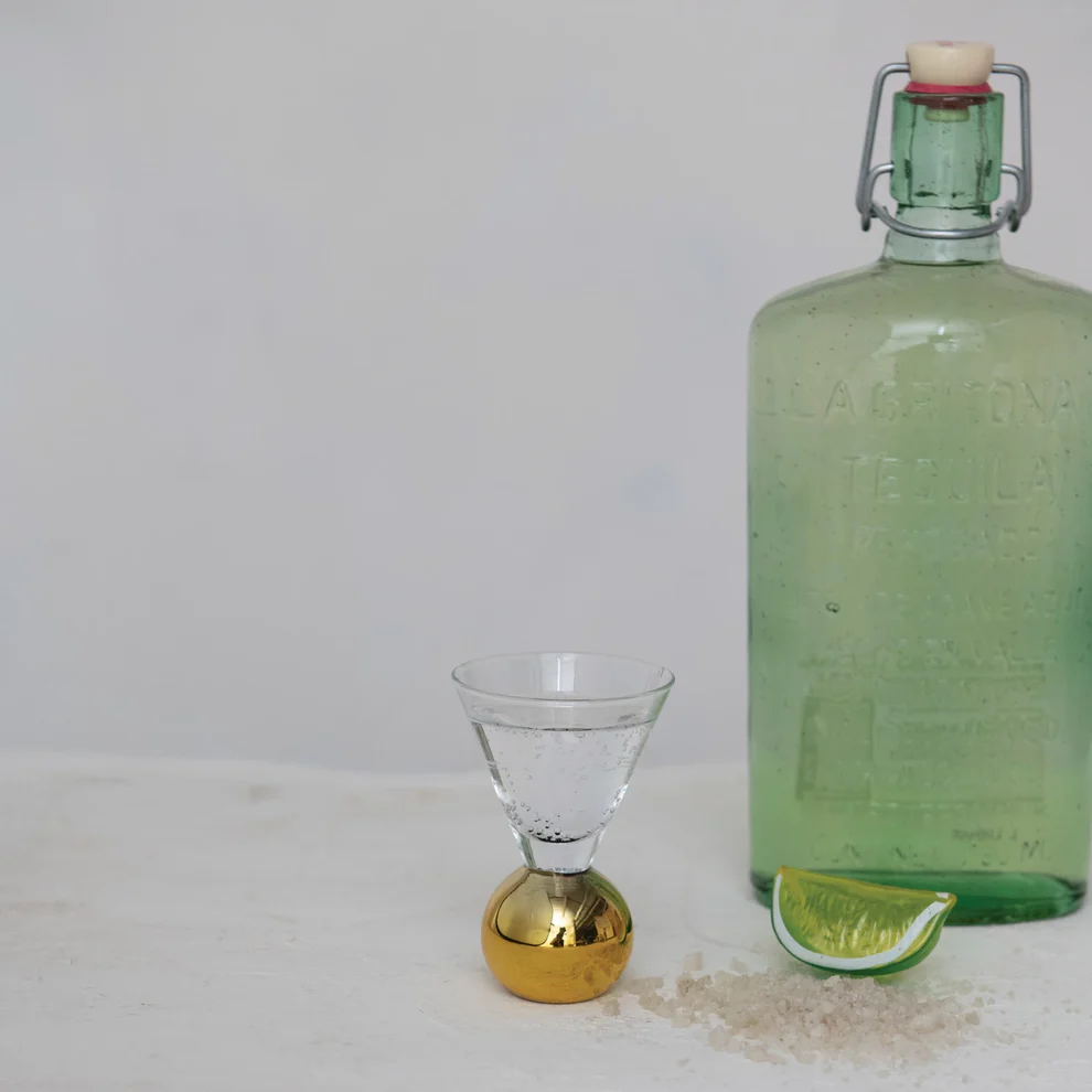 Add a touch of glamour to your barware with this 1 oz shot glass featuring a gold electroplated ball stem. Its modern design and sleek silhouette make it perfect for serving shots in style or elevating your next cocktail party.