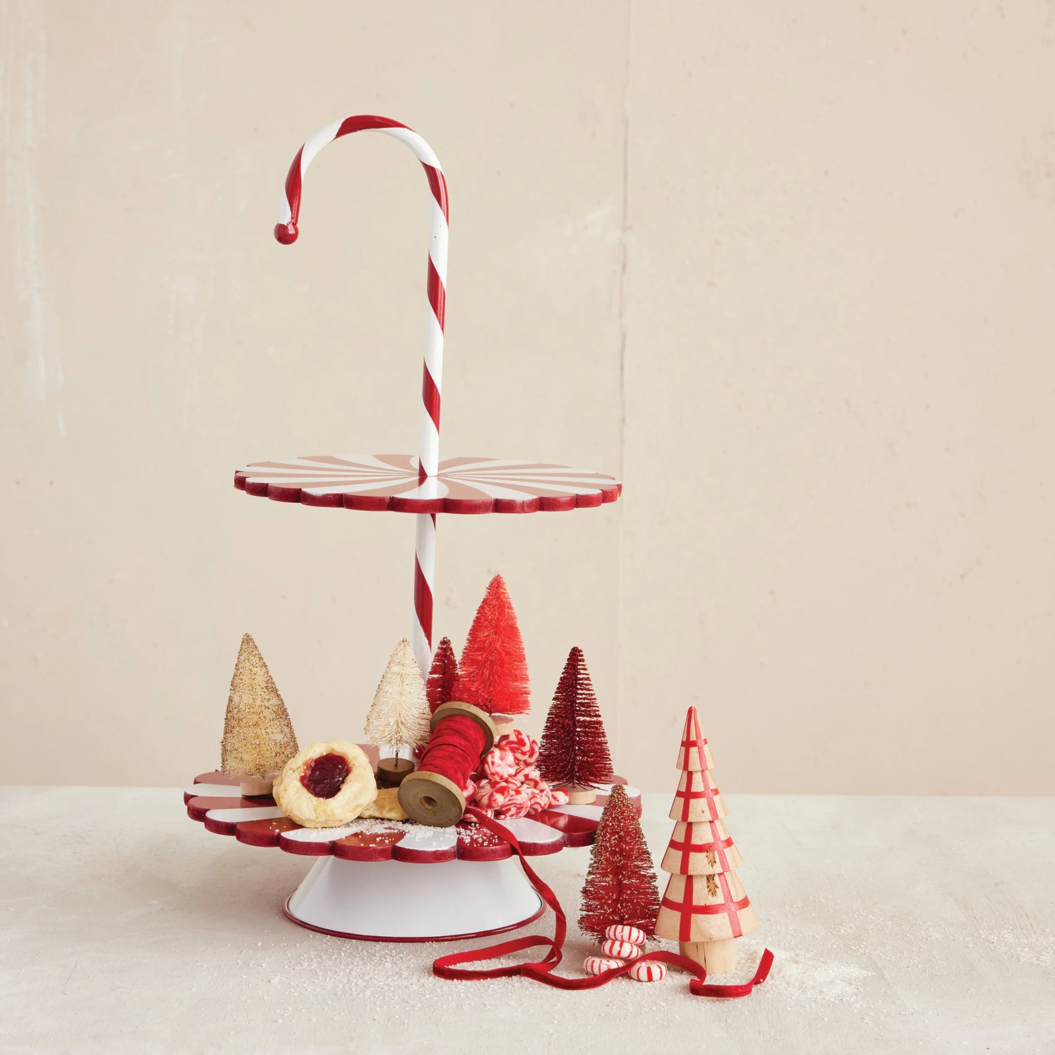 11-3/4" Round x 21-1/4"H Decorative MDF & Metal 2-Tier Candy Cane Tray, Red & White, KD