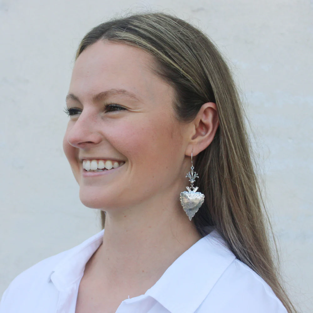a favorite in your collection, so much so, we are confident that these will become a staple in your jewelry rotation. These silver plated dangly earrings feature ear wires and a gorgeous heart design akin to the various sacred heart designs. This pair of earrings are truly eye-catching and have the potential to fulfill a graceful style or a gritty one depending on how you style them. They are perfect for solo wearing, but could be paired with other earrings if you have multiple piercings. The heartbeat of style is YOU!