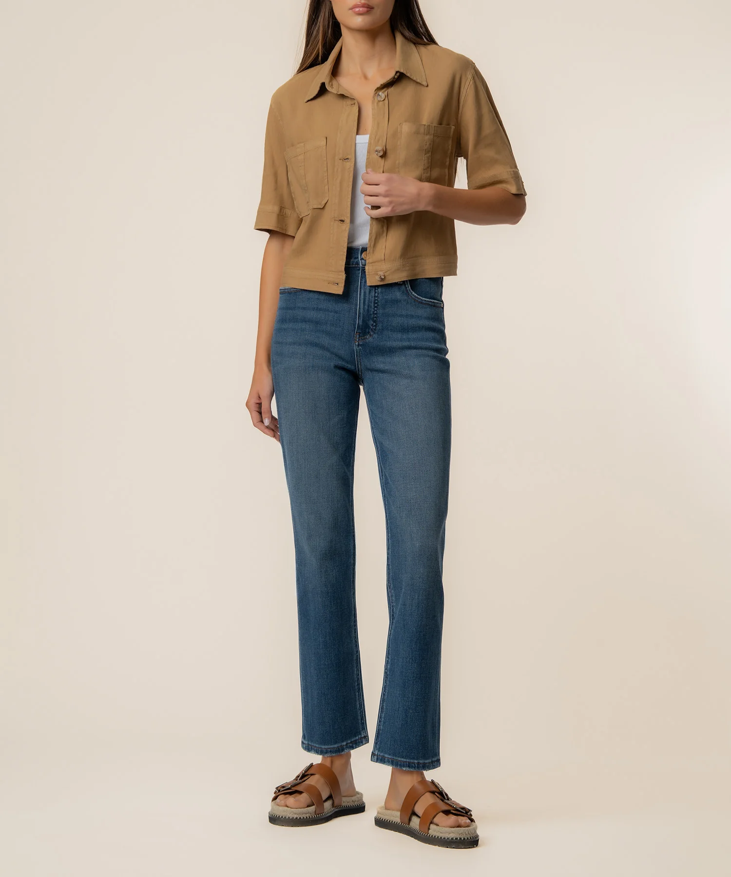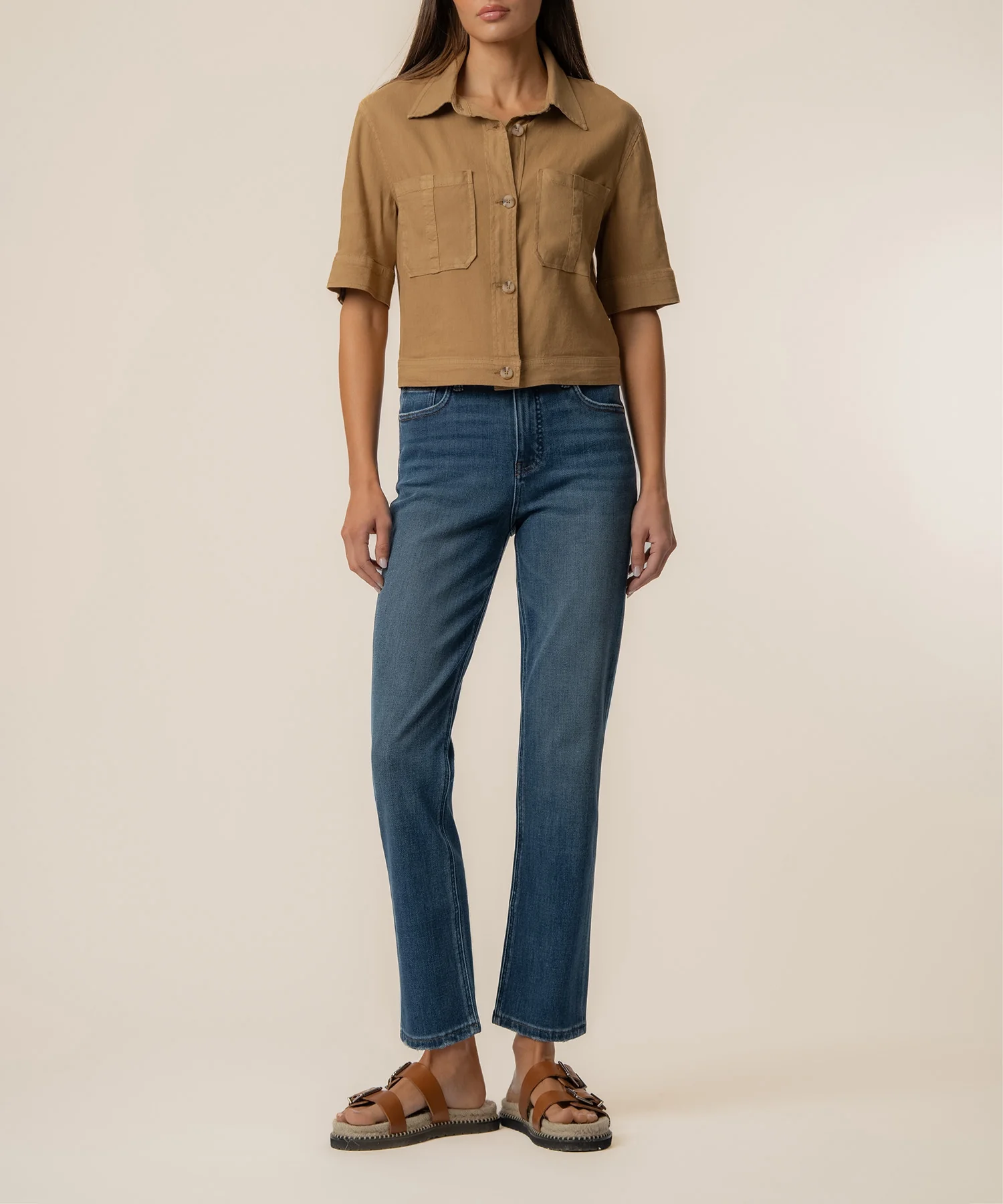 This short sleeve jacket by KUT From The Kloth is the perfect transitional layer, featuring a cropped button-front silhouette, chest pockets, and soft twill fabric.