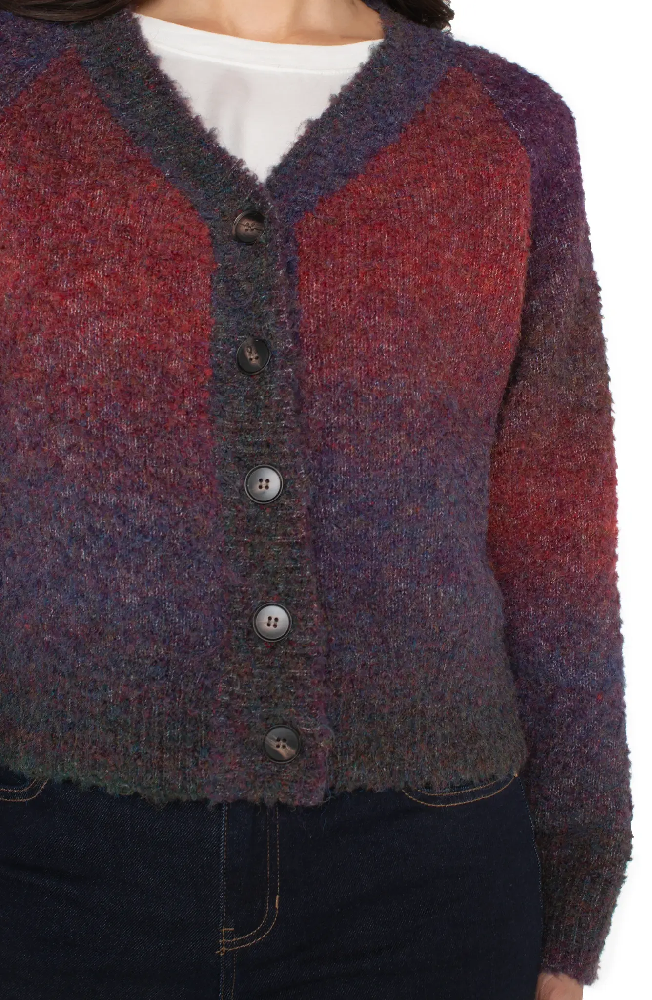 A classic cardigan, reimagined. This ombré knit in rich berry-to-burgundy tones blends timeless design with modern detail. Finished with ribbed trim and button-front closure, it’s the sweater that layers beautifully and stands on its own.