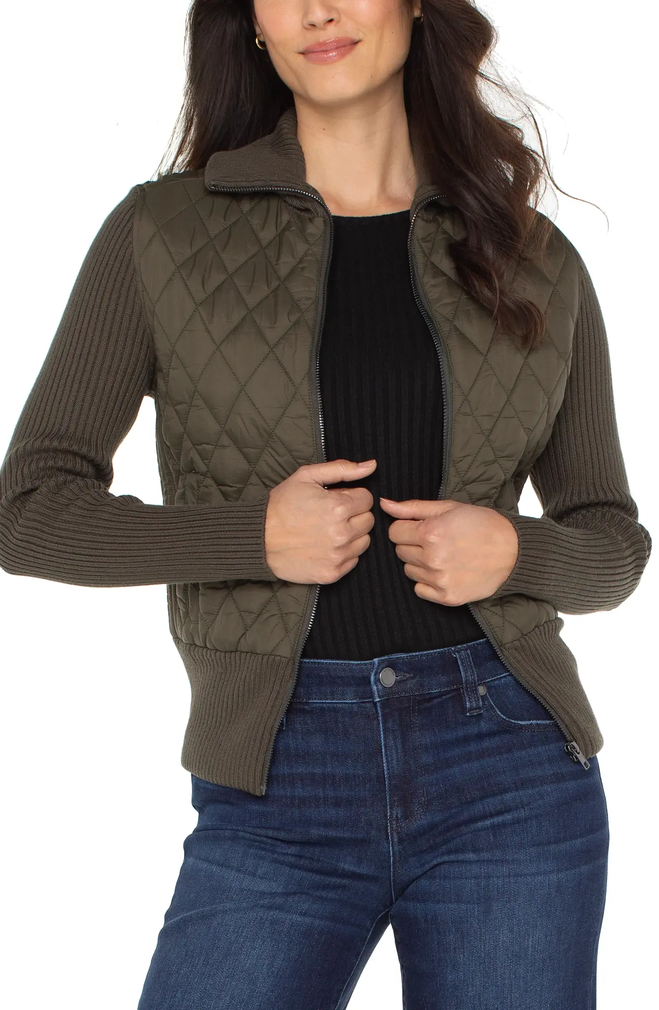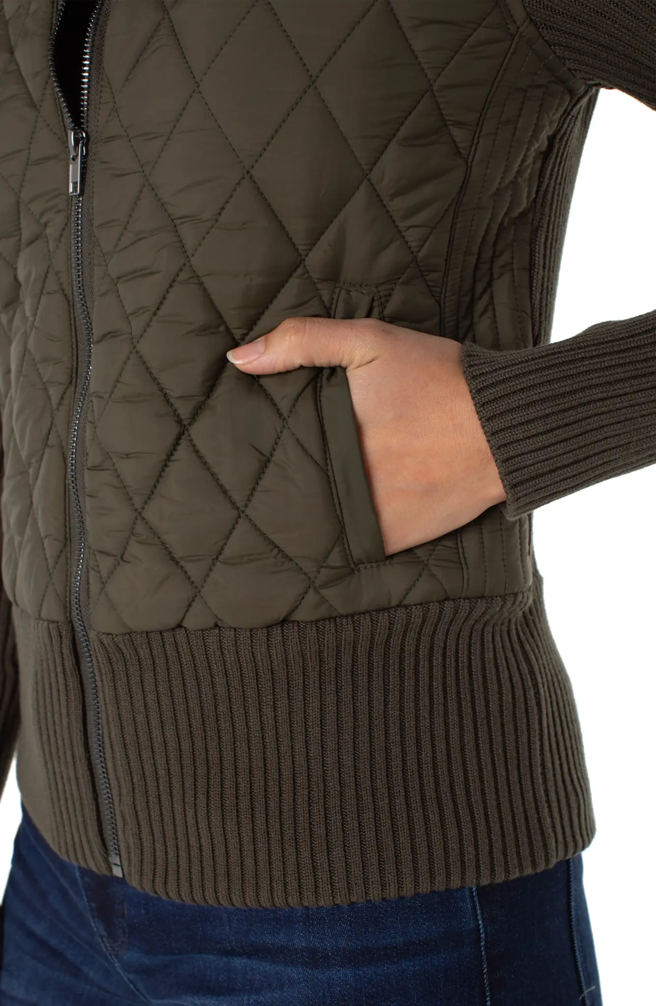 A versatile layer that blends comfort and polish. This quilted zip front sweater jacket features a soft knit collar, ribbed sleeves, and a woven quilted body for added texture and warmth. Designed with side welt pockets and a clean silhouette, it transitions effortlessly from laid-back days to refined nights.