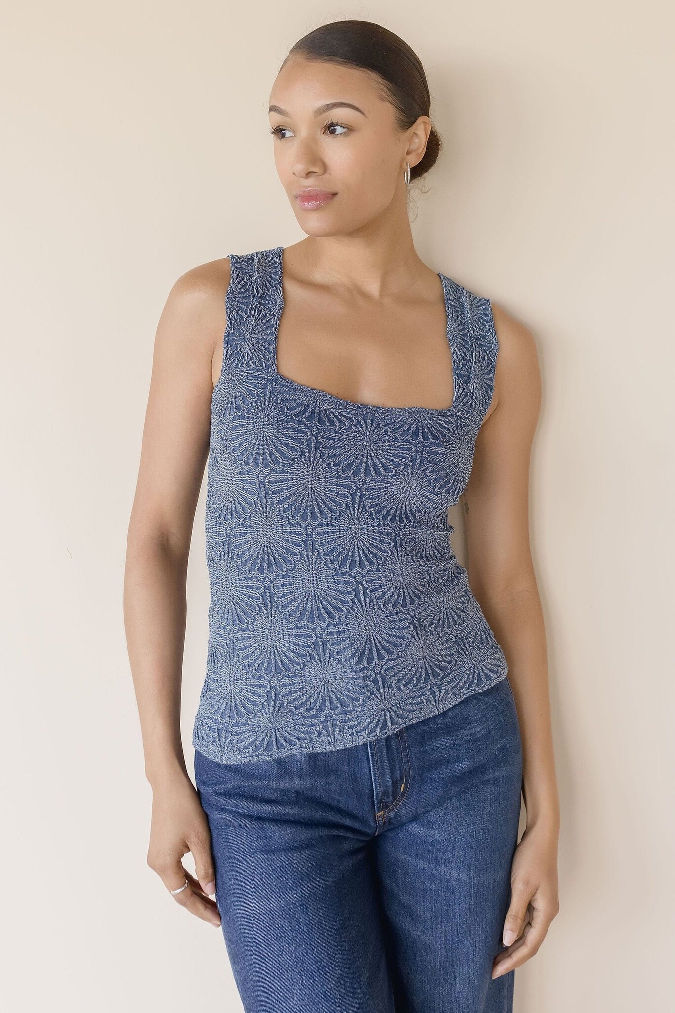 So sweet cami featured in a cropped, square-neck silhouette and jacquard floral design with statement lettuce-edge hemline.