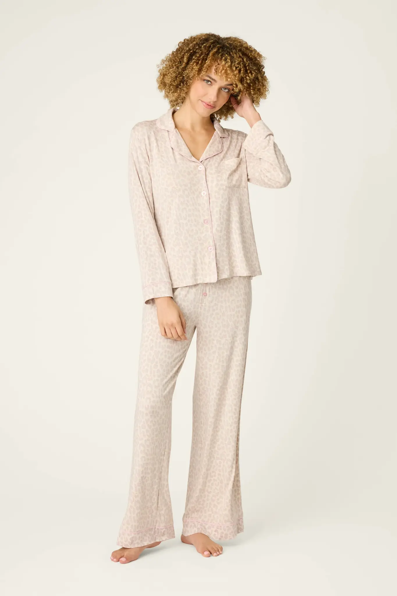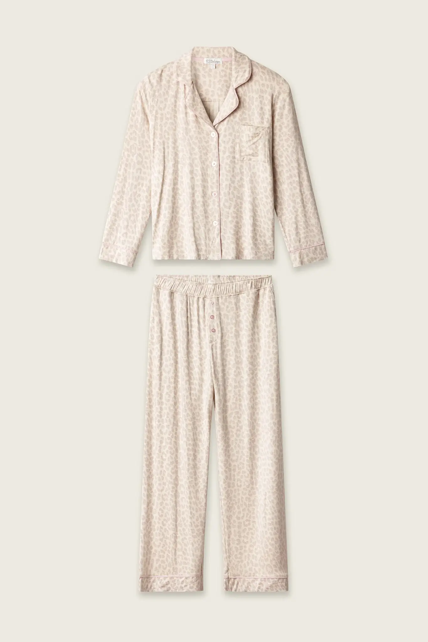 Take a snooze on the wild side. This beige leopard pajama set is crafted from soft jersey with a silky-soft, breathable feel that’s made for elevated lounging. The long-sleeve button-front top features a notched collar, pink buttons, and contrast piping, paired with wide-leg pants finished with an elastic waistband and a coordinating button placket.