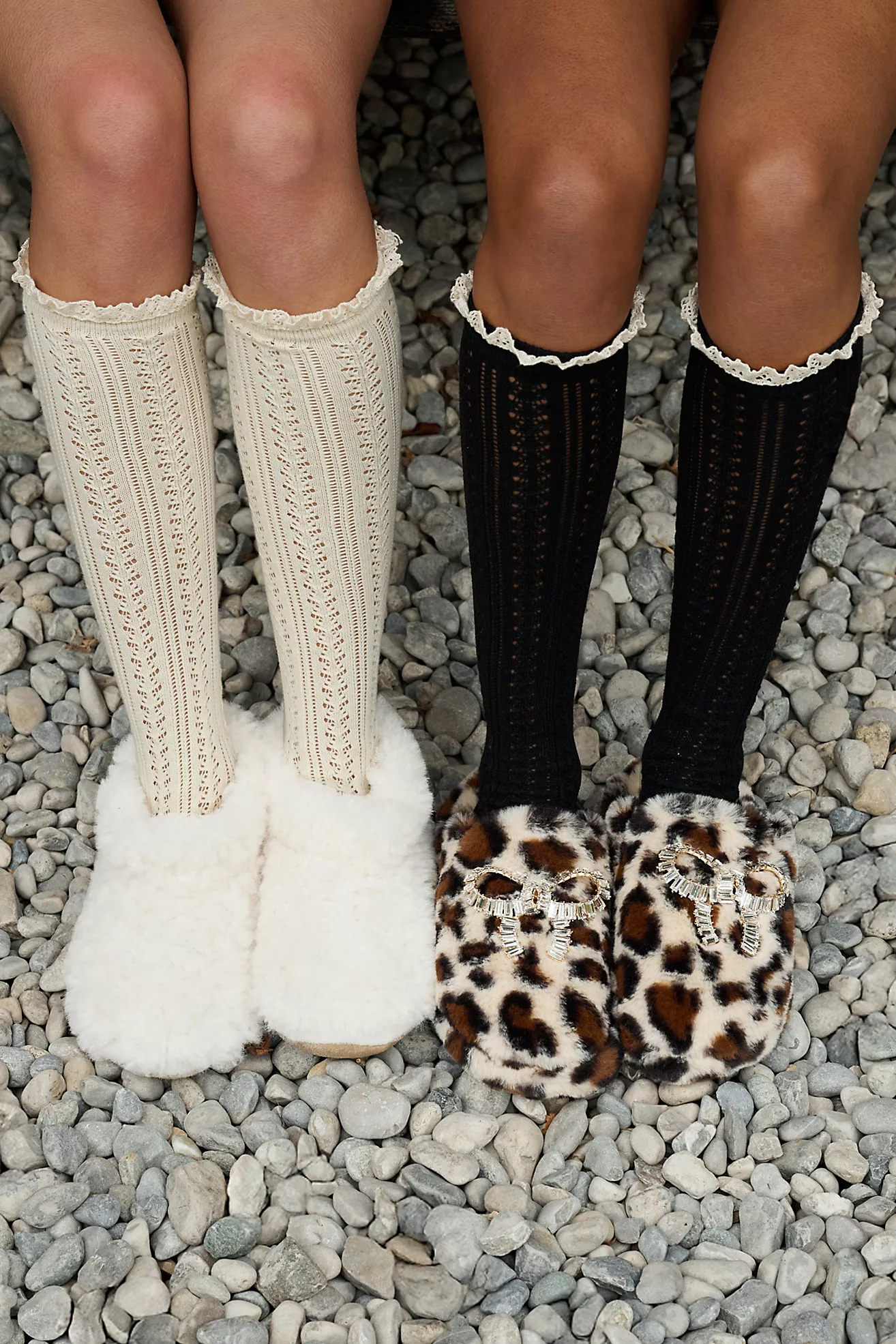The perfect blend of effortless and edgy, these so cool socks are featured in a knee-high style and pointelle fabrication with sweet ruffle trim at top for the perfect femme finishing touch.