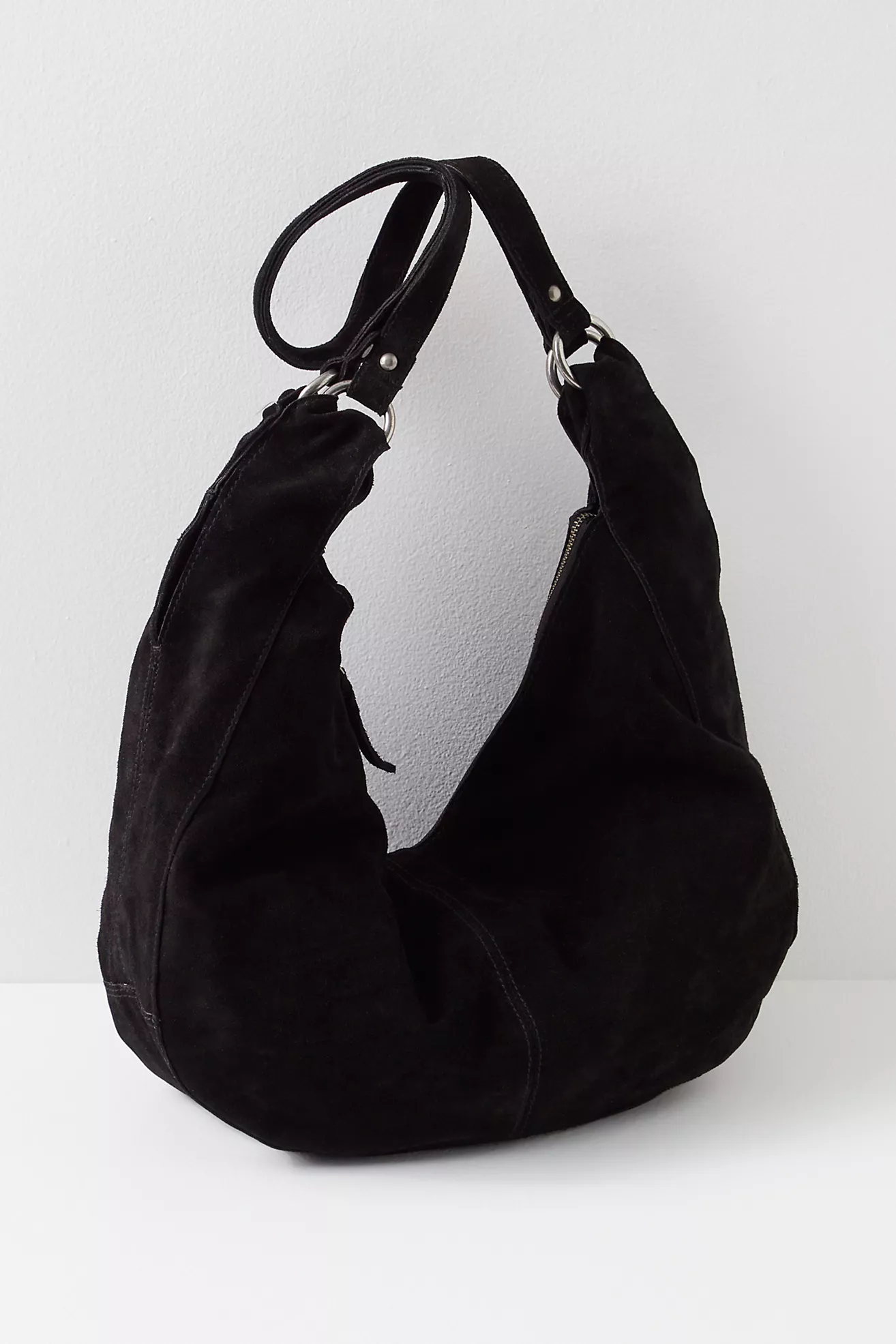 Effortlessly functional, this tote bag is featured in a slouchy hobo style with two elongated shoulder straps, all in soft suede fabrication with zipper closure for the perfect go-to bag.