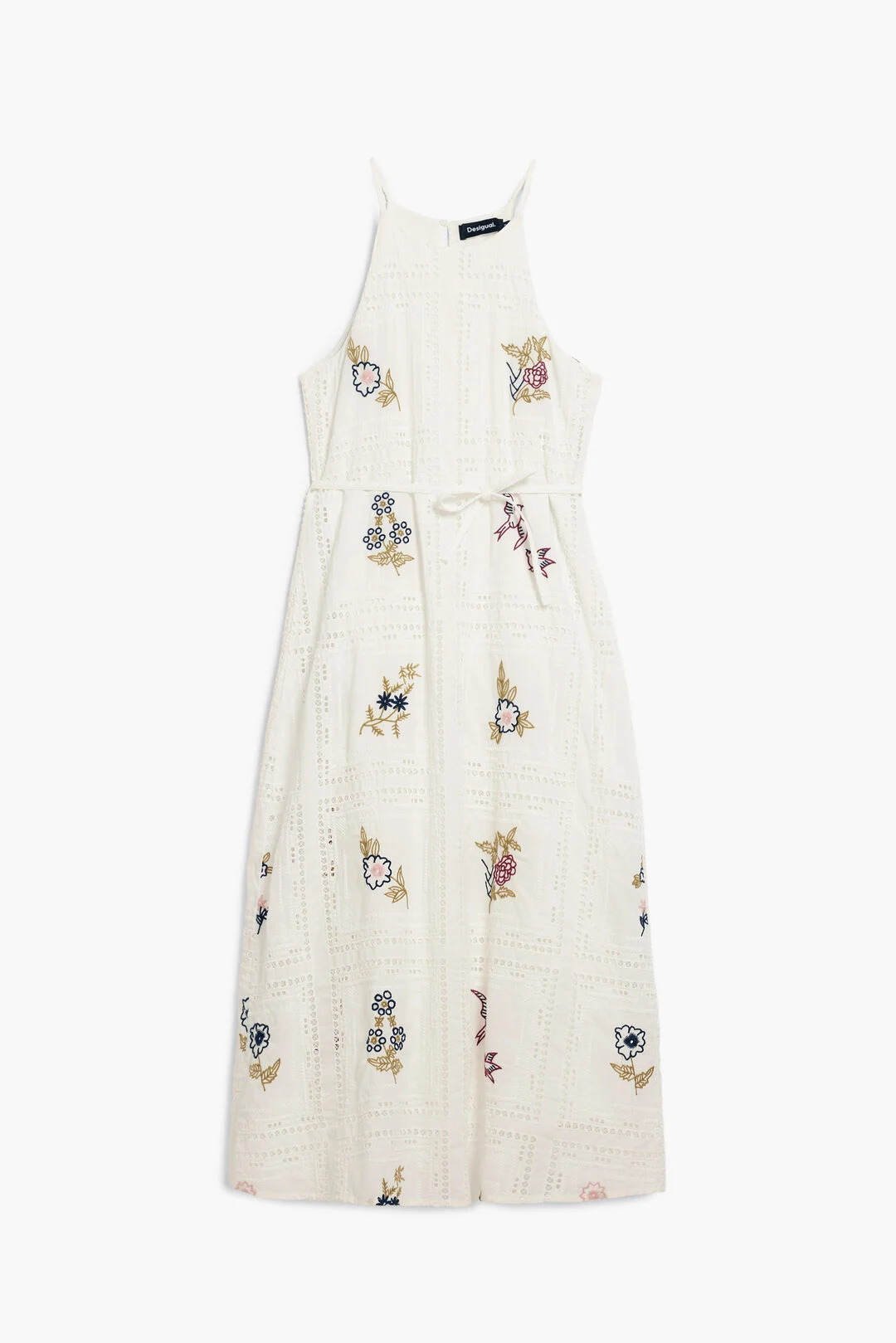 Midi dress with straps and halter neck, decorated with openwork, decorative embroidery and a belt in the same tone.