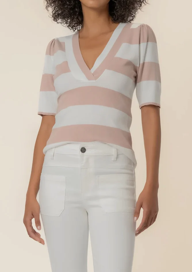 This striped sweater features short sleeves and a flattering deep V-neckline for an easy, modern look. Made from stretchy, soft material, it’s comfortable, versatile, and perfect for everyday wear.